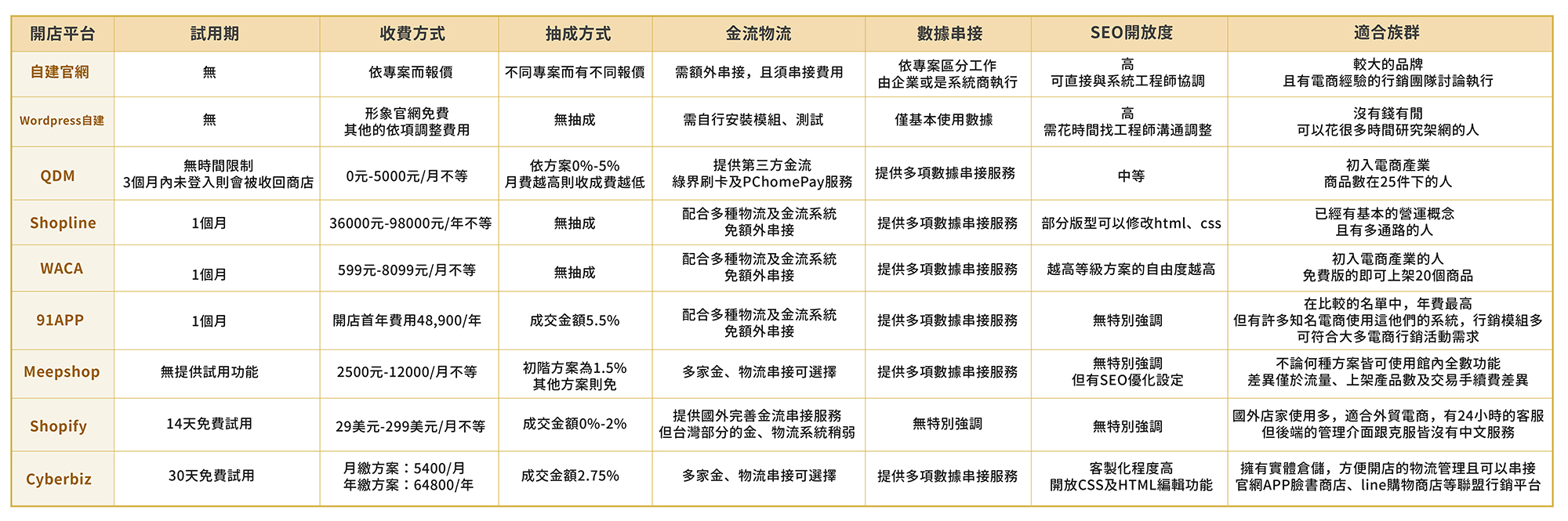 在選擇開店平台或是自建官網時,可以針對以下幾個面向去思考